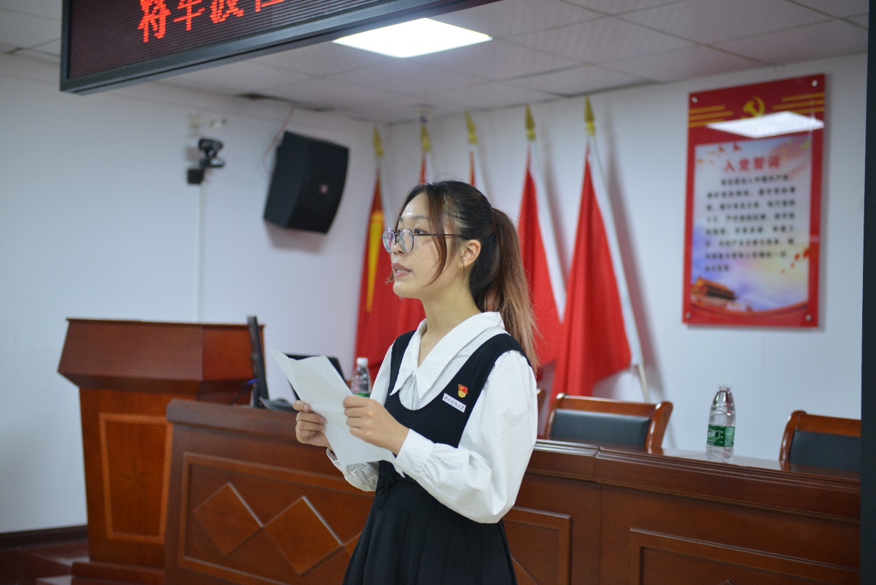 新发展党员唐超娜宣讲红色故事《将军渡》。她以彭德怀元帅和将军渡的故事展开,让大家感受到开国元帅彭德怀爱国爱民的情怀和君子怀德的担当,号召新发展党员们要不忘初心,牢记使命,在奋斗中激扬青春,在不断前行中为党旗增色。