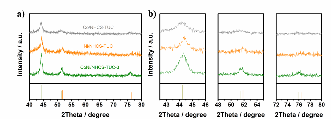 图3Co/NHCS-TUC、Ni/NHCS-TUC 和CoNi/NHCS-TUC-3的(a) XRD 图和(b)放大视图。