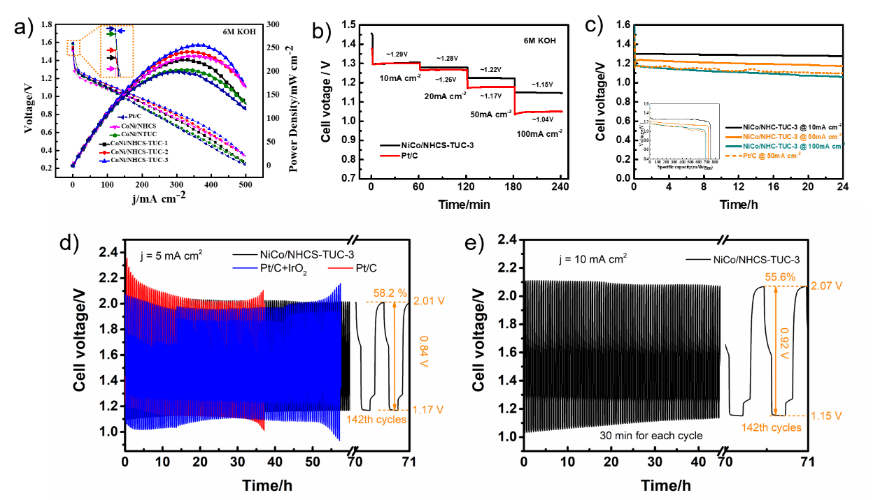 图7 (a) 使用所有制备的样品和Pt/C 作为空气电极催化剂在6 M KOH 电解液中5 mV·s-1下一次锌空气电池的极化和功率密度曲线;(b) 使用CoNi/NHCS-TUC-3 和Pt/C 的锌空气电池从10 到100 mA·cm-2的倍率放电图;(c) 使用CoNi/NHCS-TUC-3 和Pt/C 的锌空气电池在10、50 和20 mA·cm-2下的长时间(24h)恒电流放电曲线,插图:根据锌板的消耗量计算比容量;使用CoNi/NHCS-TUC-3 和Pt/C 的可充电锌空气电池在(d) 5 mA·cm-2和(e) 10 mA·cm-2的电流密度下的充放电循环曲线。