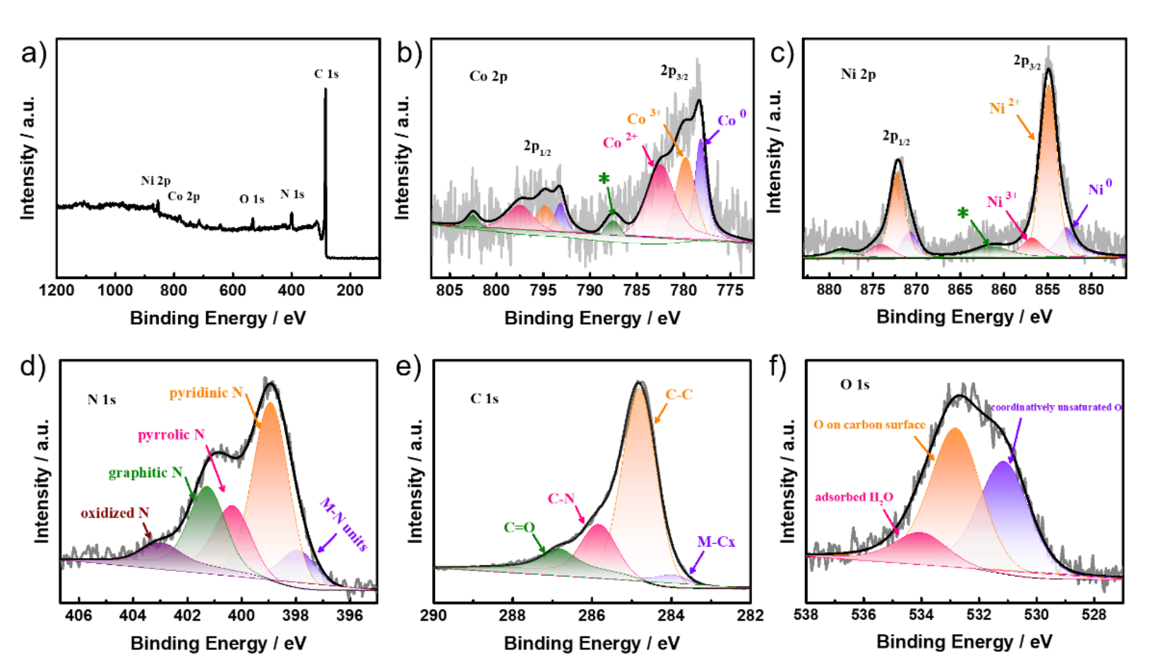 图4 (a) CoNi/NHCS-TUC-3的XPS图和(b) Co 2p;(c) Ni 2p;(d) N 1s;(e) C 1s 和(f) O 1s 高分辨率光谱图。