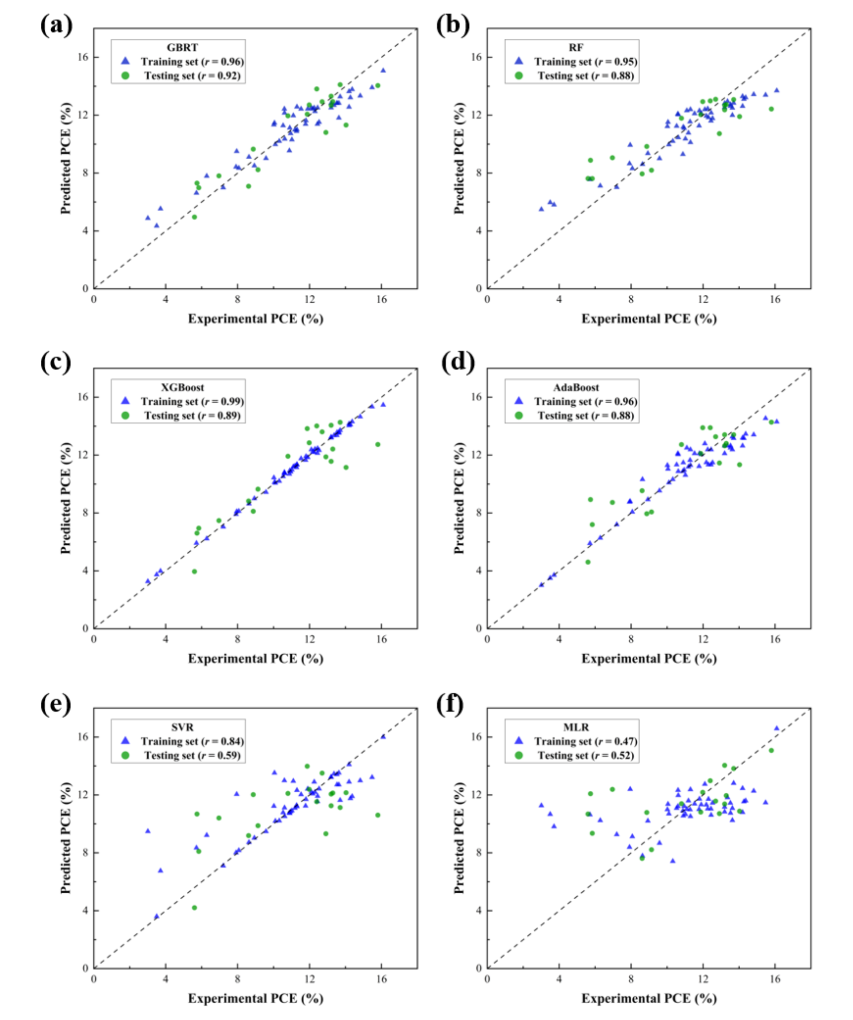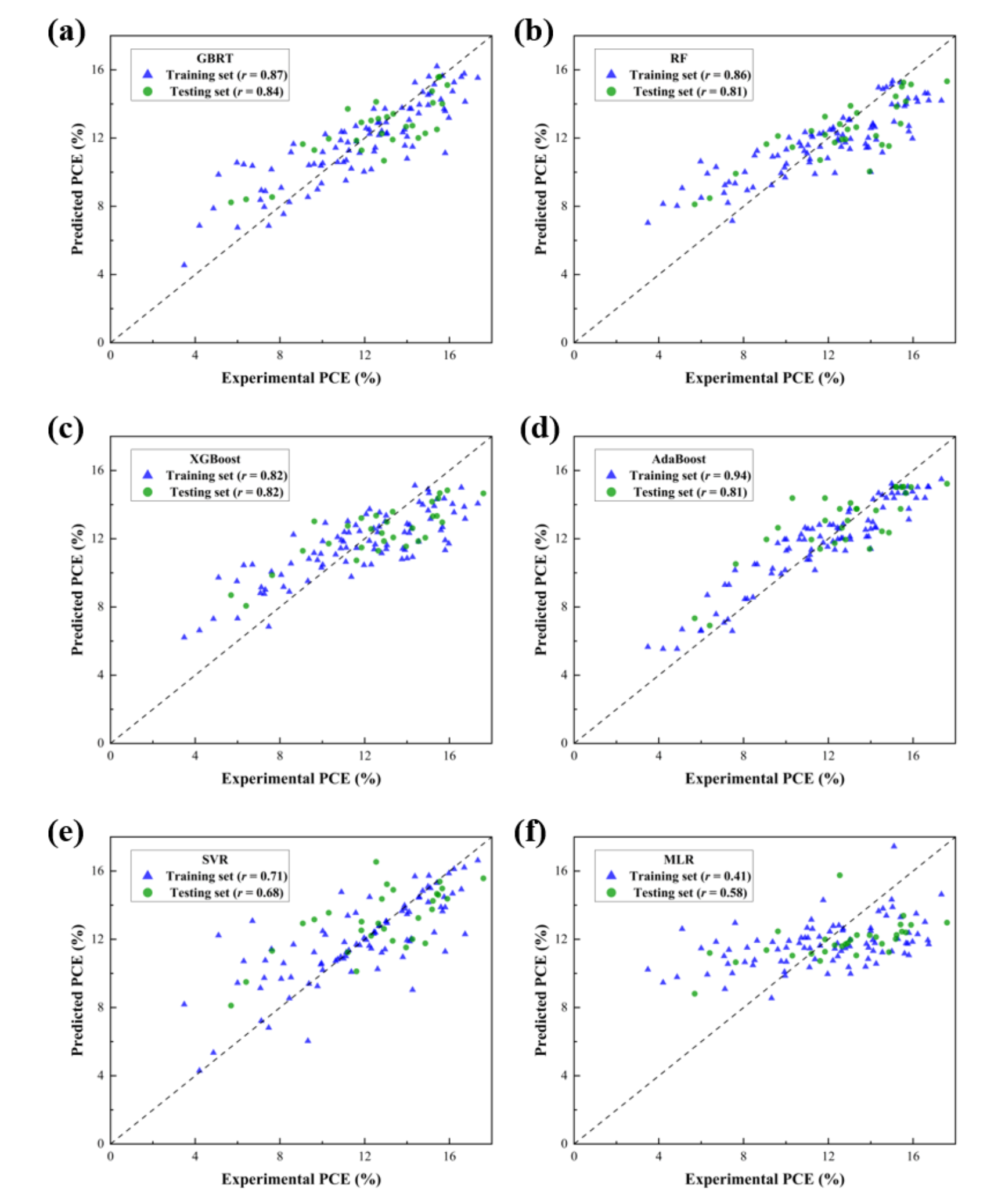 图4基于聚合物供体的机器学习预测结果值与实验值进行比较。(a) GBRT,(b) RF,(c) XGBoost,(d) AdaBoost,(e) SVR和(f) MLR。对角线表示完全正相关(r = 1)。