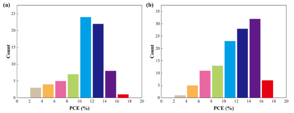 图1基于Y6受体的二元OSCs分布直方图。(a)小分子供体,(b)聚合物供体。