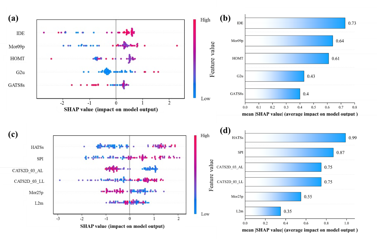 图5GBRT模型的SHAP分析。(a) (b) 基于小分子供体;(c) (d) 基于聚合物供体。