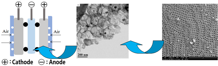 近日,SUNBET申博体育的易清风教授课题组报道了一种非贵金属的Ni-Co-N掺杂蜂窝碳纳米复合材料作为无膜直接醇燃料电池的阴极催化剂。该工作首先通过简单的PMMA模板法制备具有正六边形结构的蜂窝状碳,然后通过热解由蜂窝碳(HC),双氰胺和钴/镍盐组成的混合物,制备了NiCo掺杂的HC和C-N纳米空心管复合材料。以这种复合材料作为空气电极催化剂、碳纳米管负载的三元PdAgSn作为阳极催化剂,以乙醇,正丙醇和异丙醇为燃料,组装了无膜直接醇燃料电池。研究结果表明该阴极催化剂在碱性环境下具有优异的抗醇性,所组装的无膜直接醇燃料电池能以较长时间稳定放电。