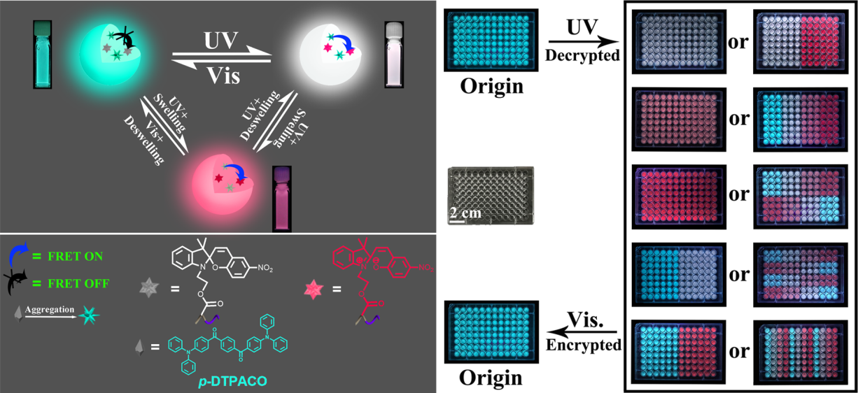 近日,SUNBET申博体育理论有机化学与功能分子教育部重点实验室的陈建教授研究团队报道了利用细乳液聚合法,将具有AIE效应的给体荧光染料 1,4-苯基-双((4-二苯胺基)苯基)甲酮( p -DTPACO)和受体(螺吡喃)及单体(苯乙烯)共聚合制备新型双色光开关荧光聚合物纳米粒子。结果表明,通过优化给体-受体比例,该聚合物纳米粒子具有光和溶剂可调的开关对比度和发光颜色。另外,该团队还利用调控FRET效率的策略成功制备了具有开关可调至稳定白光的纳米粒子,并进一步将上述光开关荧光聚合物纳米粒子应用于数据加密。该研究对光开关荧光纳米材料在数据加密,显示照明和生物成像等领域具有潜在应用价值。