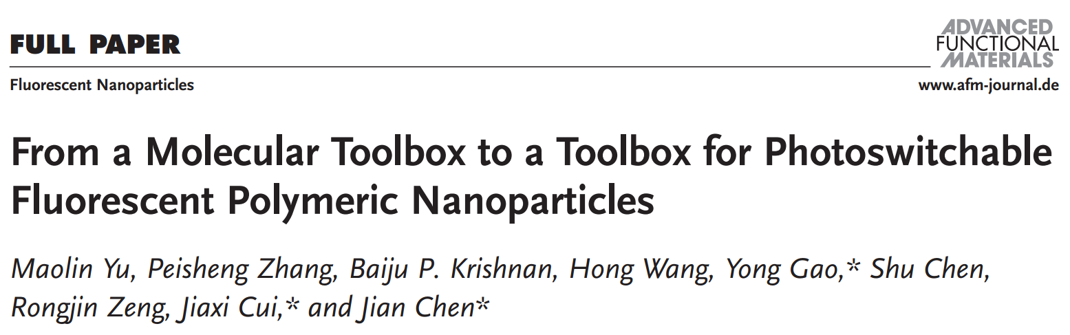 近日,理论有机化学与功能分子教育部重点实验室陈建教授团队在材料领域国际顶级期刊《Advanced Functional Materials》上在线发表了光开关荧光纳米材料研究新成果:“从分子工具箱到光开关荧光聚合物纳米粒子工具箱(From a Molecular Toolbox to a Toolbox for Photoswitchable Fluorescent Polymeric Nanoparticles)”。(论文链接:https://doi.org/10.1002/adfm.201804759)。