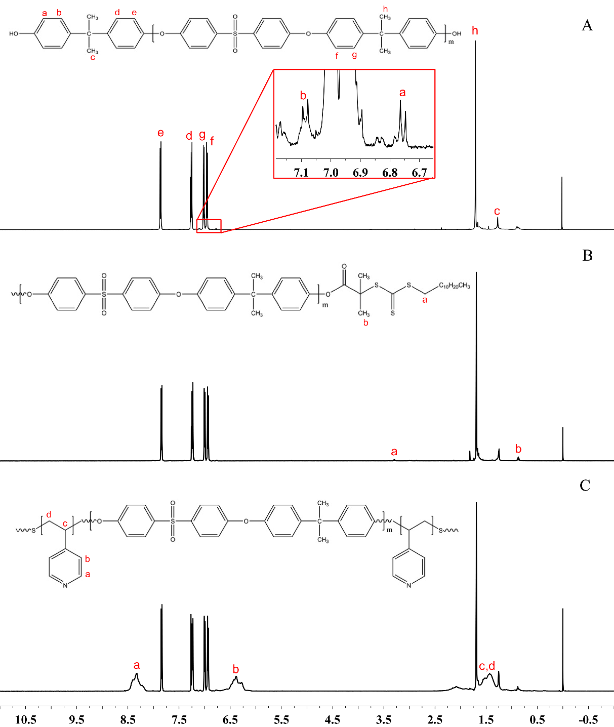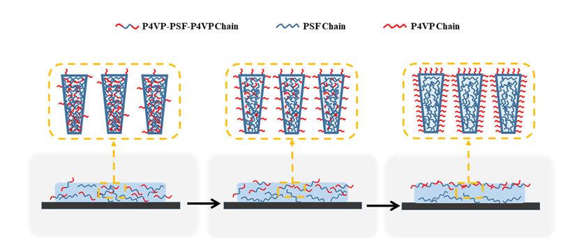 公司曾坚贤教授课题组在近期工作基础上(J. Membr. Sci. 572 (2019) 428-441,一区;J. Hazard. Mater. 333 (2017) 128-136,一区;React. Funct. Polym. 115 (2017) 1-9,二区),进一步研究4,4'-二氯二苯砜与双酚A反应制备双羟基封端聚砜,然后以其两端的羟基与三硫酯反应合成大分子链转移剂,以4-乙烯基吡啶为亲水性功能单体,与大分子链转移剂合成两亲性嵌段共聚物--聚(4-乙烯基吡啶)-b-聚砜-b-聚(4-乙烯基吡啶)(P4VP-PSF-P4VP)。
