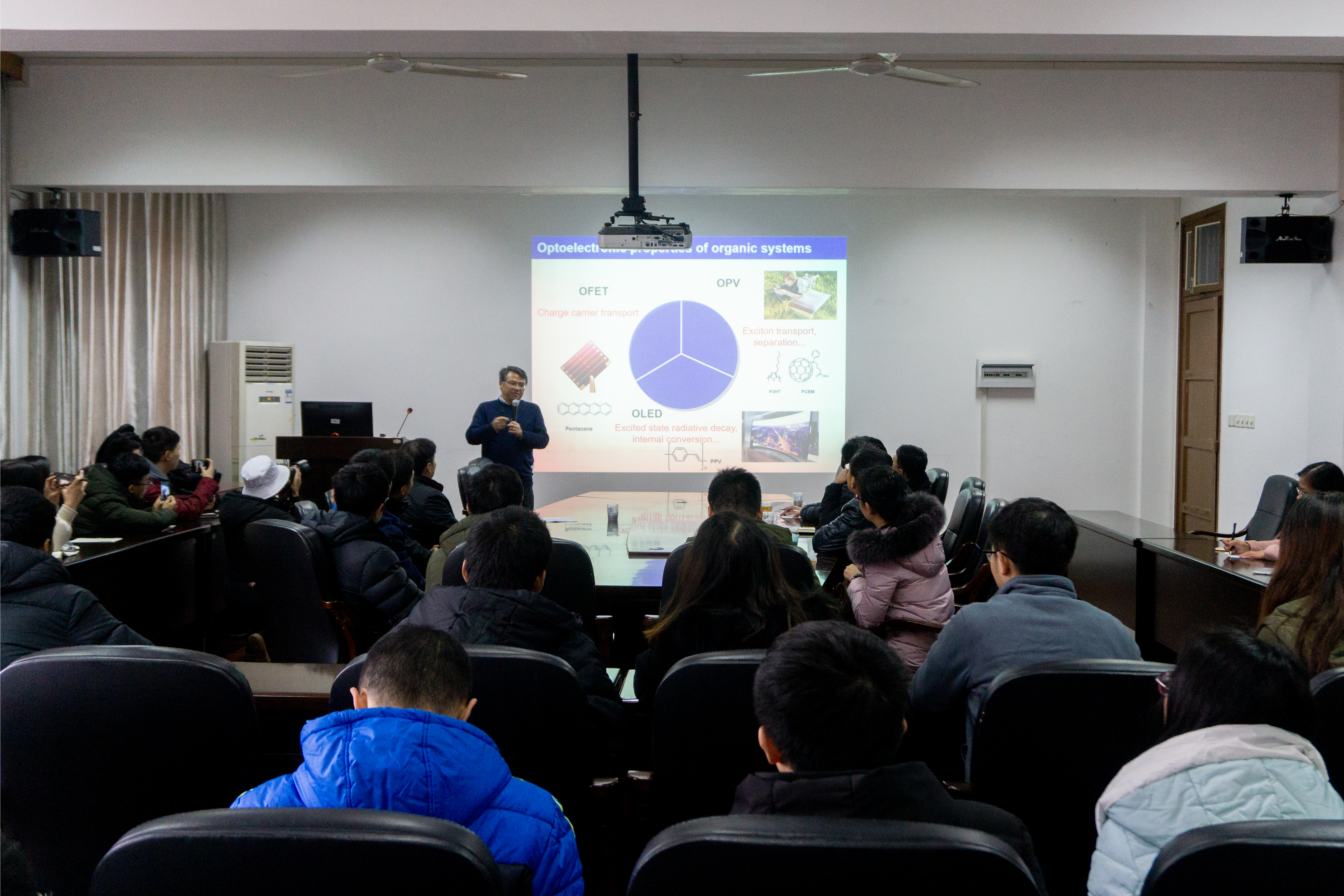 讲座伊始,帅志刚教授介绍了有机系统光电性质的基本内容及其相关研究背景。他从近期工作说起,阐述激发态衰变的相关知识以加深同学们的了解,并向大家说明蓝色发射器效率低的原因和解决方法。紧接着,他针对室温磷光RTP的相关内容进行详细分析,其中包括有效的ORTP和长余辉及持久高效的纯有机RTP。随后,帅教授对有机半导体中的载流子迁移率进行微观描述,介绍了他在该问题上的研究进展并提出核效应对于理解有机半导体光敏性至关重要。