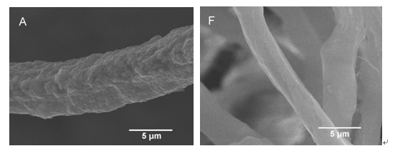 Figure 2. The morphological of (A) AgCl/Collagen Fiber and (F) Pure Collagen Fiber.