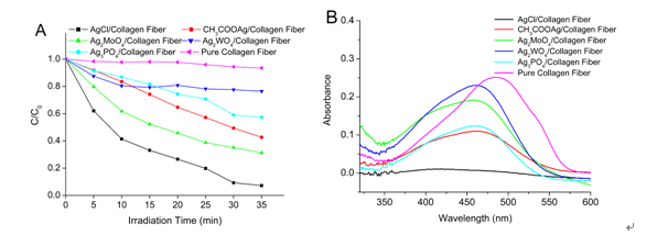 该论文为:Hu Zhou, Jie Zhou, etc. In-situ preparation of silver salts/collagen fiber hybrid composites and theirphotocatalytic and antibacterial activities,J. Hazard. Mater., 2018, 359, 274-280.