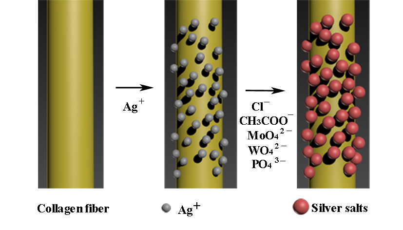 近日,公司周虎教授研究团队利用从皮革固体废弃物中提取的胶原纤维,采用原位生成纳米银盐颗粒的方法,成功制备了胶原纤维/纳米银盐杂化材料。具体地,利用胶原纤维富含的-COOH、-CONH-、-CONH2、-NH2等活性基团对金属银离子的富集作用,运用有机-无机原位杂化技术,探索了胶原纤维/纳米银盐杂化材料制备的新方法,构建了原位生成纳米银盐改性胶原纤维的基本理论。后期还系统研究了胶原纤维/纳米银盐原位杂化材料的微观结构、可见光催化处理染料废水性能、抗菌防霉性等。该研究不仅实现了胶原纤维的原位修饰改性,还赋予胶原纤维基杂化材料新的功能与特性,这将为探索生物质的新型改性方法和有机-无机杂化材料的制备提供重要参考价值。
