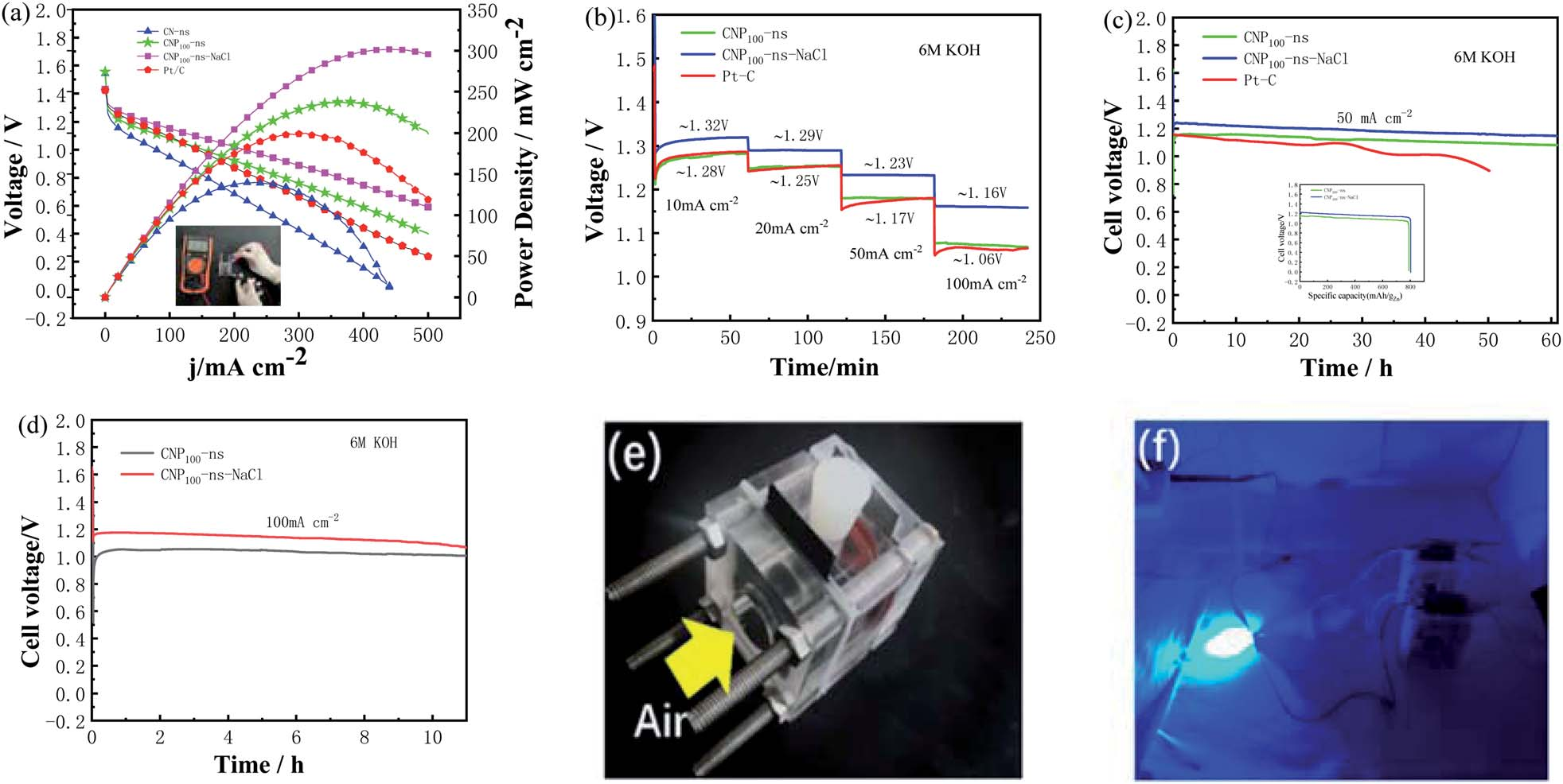 近日,SUNBET申博体育的易清风教授研究团队利用简单的热解过程,制备了无金属的氮磷共掺杂的碳纳米片复合物,将其作为阴极催化剂应用于锌-空气电池,获得了优异的放电性能。以双氰胺作为碳氮源,三苯基磷为磷源,以氯化钠为造孔剂,经高温热解后得到氮磷共掺杂的碳纳米片复合物,其厚度约为1.29nm。经测试,催化剂对氧还原反应具有优异的电催化活性,各项指标达到商品Pt/C。将催化剂作为阴极材料,应用于自组装的锌-空气电池,电池开路电压为1.52 V,最大功率密度达到302 mW cm2,比容量达到801 mA h gZn-1。此外,电池在不同放电电流下均表现出良好的稳定性。本工作为制备新型的碳氮复合物纳米材料,并应用于电化学新能源体系提供了新的策略。