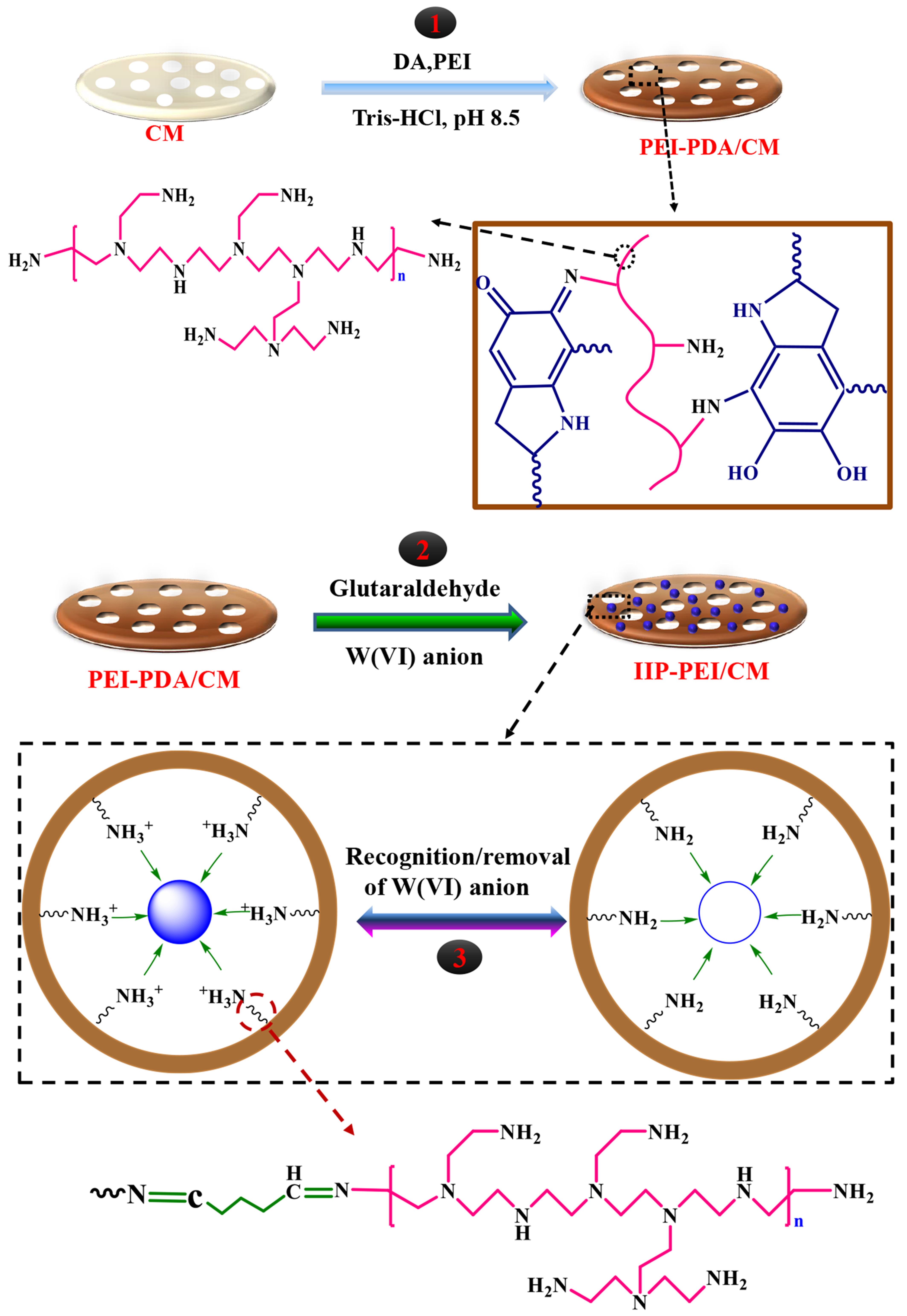 近期,SUNBET申博体育曾坚贤教授课题组报道了采用三氧化二铝陶瓷膜为载体,以W(VI)或Mo(VI)为模板离子,多巴胺/聚乙烯亚胺共沉积或1-乙烯基咪唑为功能单体,戊二醛或1,6-二溴己烷为交联剂,CuSO4/H2O2为催化剂,采用表面印迹和接枝聚合方法,成功制备了能选择性分离W(VI)或Mo(VI)的新型印迹陶瓷膜。该印迹陶瓷膜对W(VI)或Mo(VI)具有较大的吸附容量,较高的选择性分离系数,较快的吸附动力学,且再生和循环使用性能良好。该工作探索了印迹聚合物高效选择性和陶瓷膜优异分离性能的结合行为,为复合陶瓷膜选择性分离金属离子提供了新思路。