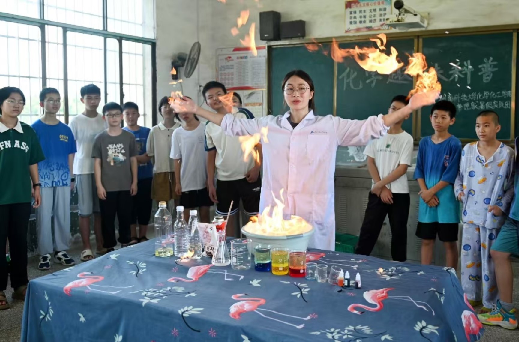 少年强则国强,科技兴则国兴。实践团成员们为茶铺村小朋友们打造化学科普小课堂。在科普课堂上,实践团成员们化身为“化学魔法师”,个个大显神通,为小朋友们带来“火焰掌”、“七彩水母灯”、“发光管”、“法老之蛇”等化学趣味实验,在小朋友们的欢声笑语和阵阵惊叹中,将一颗热爱科学的种子深深的埋在他们心中。小小的实验台承载了大大的梦想,实践团成员们用科幻的化学实验,拓宽了青少年们的科学视野,进一步激发了孩子们学科学、爱科学、用科学的热情。