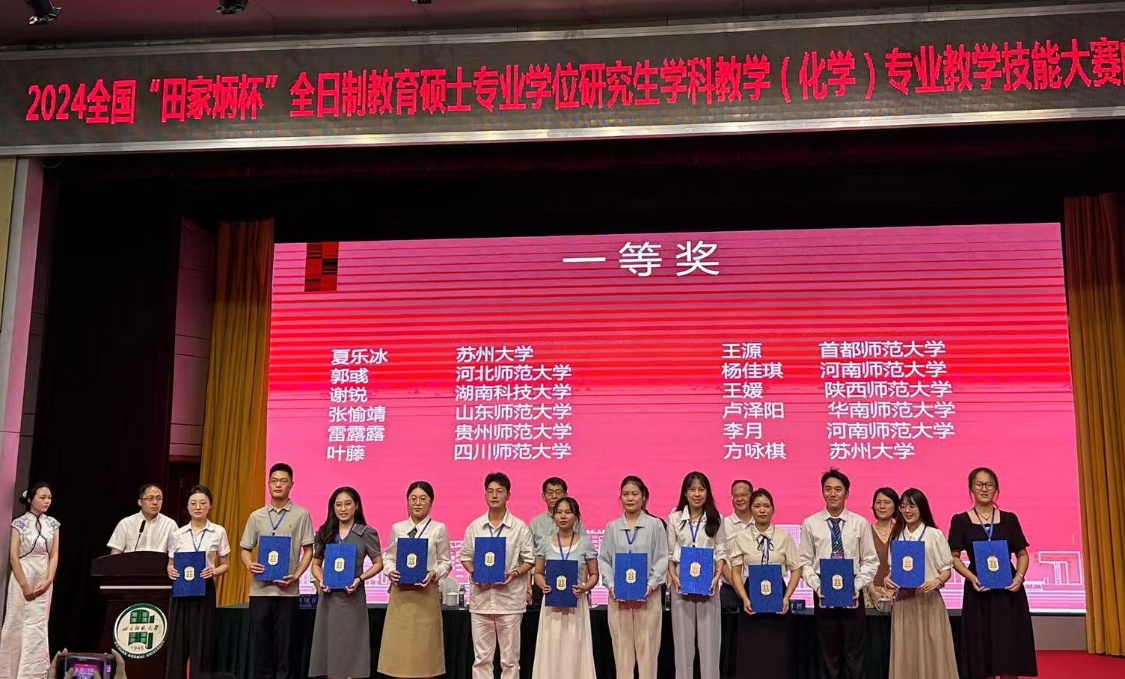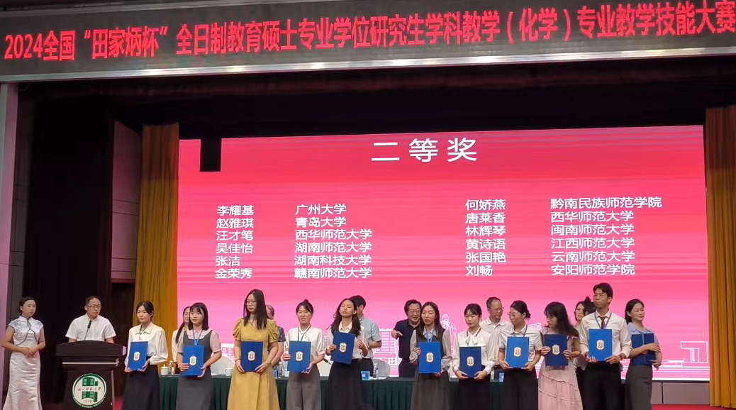 2024年9月8日,2024年全国“田家炳杯“全日制教育硕士学科教学(化学)专业学位研究生教学技能大赛在四川师范大学顺利落幕,SUNBET申博体育本次入围决赛的两名选手全部获奖。其中,2022级谢锐同学大赛一等奖、2023级张洁同学获得大赛二等奖。这是公司研究生参加该赛事以来的最高获奖也是获奖人数最多的一次。