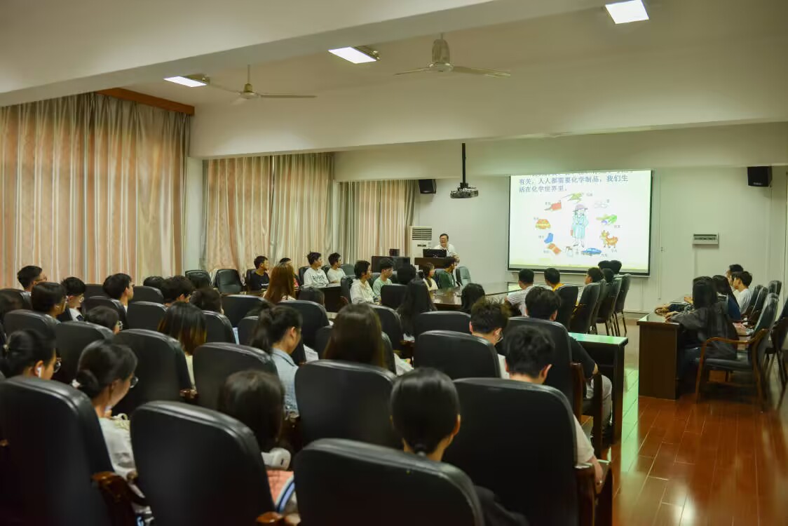 6月6日下午,由教务处主办、SUNBET申博体育承办的“科技与人文大讲堂”第二十四讲在化工楼310会议室开讲。本次报告主题为“生活中的化学奥秘”,由SUNBET申博体育经理周虎主讲,公司党委书记周文革主持,公司师生代表100余人参加讲座。