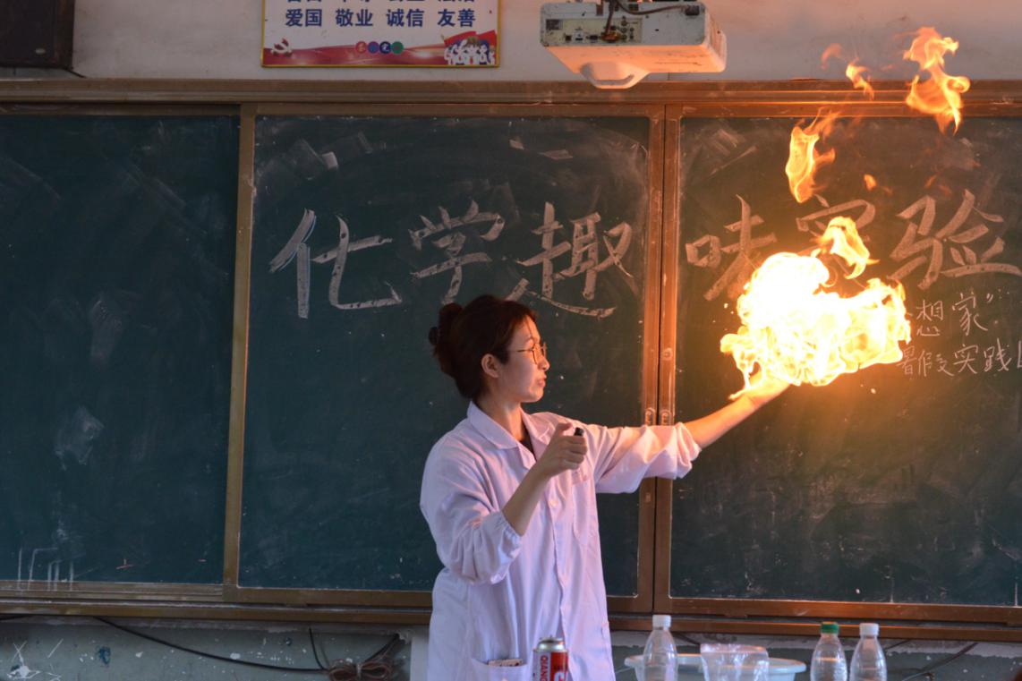 紧接着,“火焰掌”实验将课堂气氛推向了高潮。实践团成员们用手捧起气泡点燃,火势迅速增长。小朋友们瞪大眼睛,目不转睛地盯着那跳跃的火焰,心中充满了对科学的敬畏与向往。实践团成员王语彤说:“为了这次暑假实践,我 们精心准备了多个化学科普小实验,希望通过这些化学科普实验,为当地小孩子打开科学的大门,激发他们对科学的兴趣。”