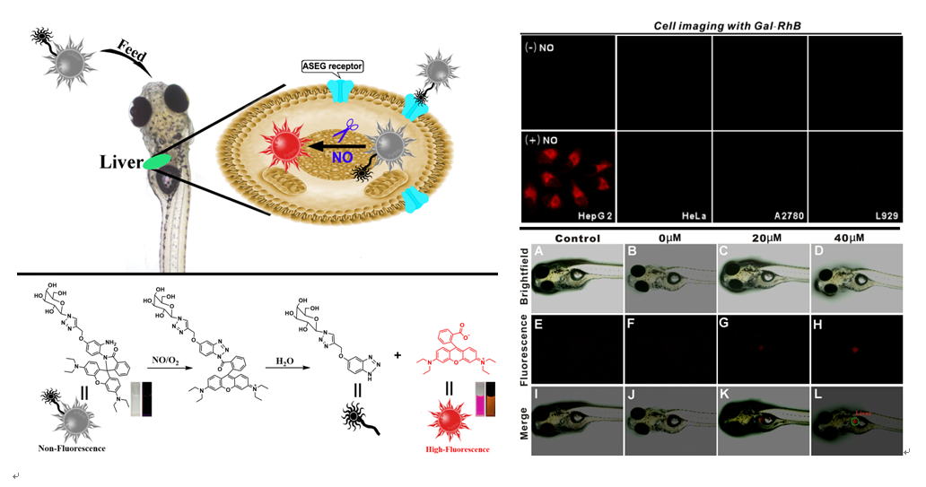 近日,SUNBET申博体育理论有机化学与功能分子教育部重点实验室的张培盛博士研究团队首次报道了一种肝靶向NO荧光探针(Gal-RhB),实现了斑马鱼内肝脏中NO的原位成像检测。Gal-RhB以市售罗丹明B为母体结构,通过将邻苯二胺(NO识别基团)和半乳糖(肝靶向基团)引入罗丹明B结构中,构建了肝靶向NO荧光探针(Gal-RhB)。半乳糖基团的引入不仅增加了探针的水溶性,也有利于探针被肝细胞特异性摄取。细胞和活体成像研究表明:该荧光探针(Gal-RhB)能够被肝细胞特异性摄取,并应用于肝细胞和肝脏中NO的荧光成像分析。该研究对进一步了解NO与肝脏相关疾病的发生发展作用研究具有重要的意义。