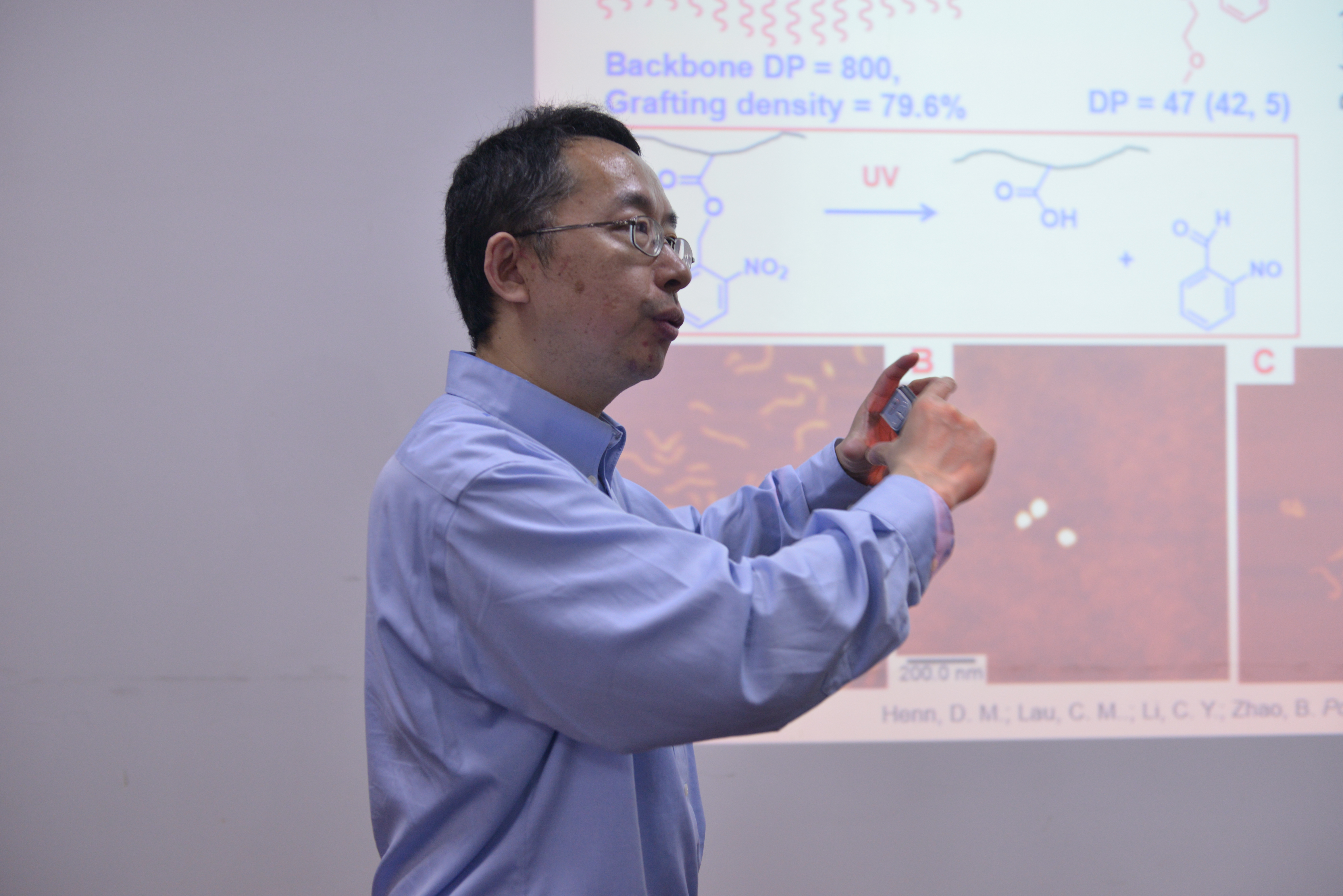 5月6日下午4点,应公司和理论有机化学与功能分子教育部重点实验室邀请,美国田纳西大学赵斌教授在化工楼310学术报告厅,以“Macromolecular Brush Materials(高分子刷材料)”为主题作了一场精彩的学术报告。报告会由理论有机化学与功能分子教育部重点实验室主任唐子龙教授主持,SUNBET申博体育、理论有机化学与功能分子教育部重点实验室师生80余人到场聆听。