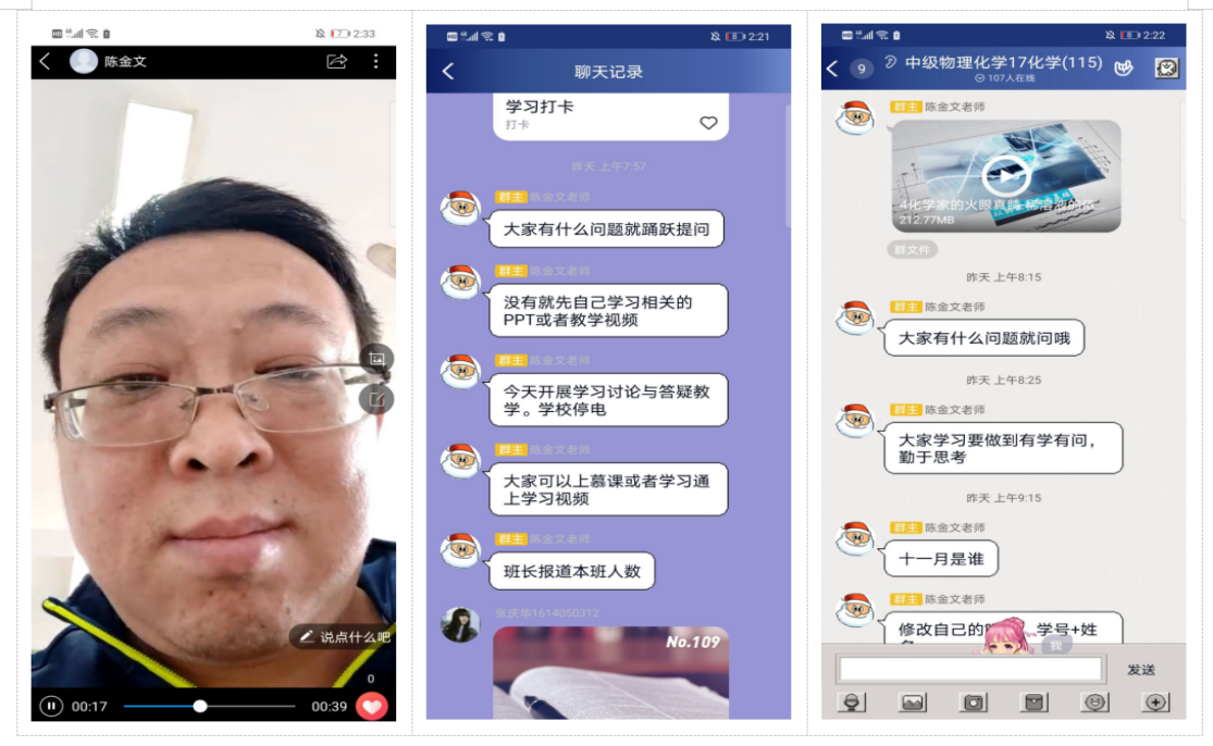 陈金文老师:在第一次QQ群直播课堂上,就给同学们强调了新型冠状病毒与化学的联系,强调了学习的重要性。借助超星学习通安排课后作业,在每次批改作业后会将员工错误较多和不理解的地方再讲解,确保每位同学对知识点的理解,带领员工进行归纳总结,保证了教学质量。同学们表示陈老师的课堂亲切且有感染力,明确了自己的学习方向。