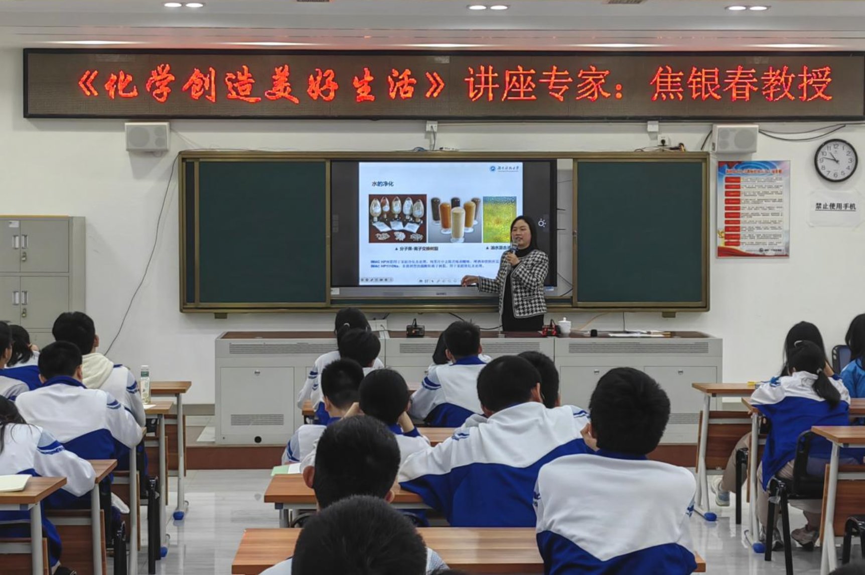 焦老师用通俗易懂的表述诠释了化学研究的内涵,现场的同学们仔细聆听、积极互动,加深了对化学的认识和对美好生活的期许。会场气氛热烈,展现了高中生朝气蓬勃、渴望求知的精神面貌。